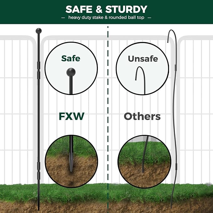 - Unlock your freedom, savor the moment: The stakes are designed with rounded ball tops to protect the dog's claws from injury. The rods are easily inserted into the ground for greater stability and rigidity, which won't collapse when the dog leans against them. Also, the automatic gravity-actioned locking mechanism will ensure you can open and close the door smoothly and reduces the chance of dogs unlocking by themselves. All of this is designed for absolute safety, so you can really relax.