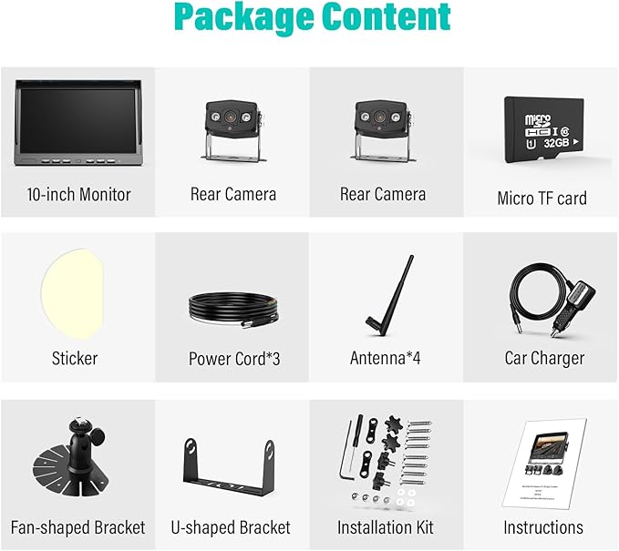 - ππ Upgraded Wireless Signal System: This wireless back up camera system includes a 10 inch monitor and 2 wireless backup cameras. Adopts 2.4G wireless digital transmission and upgraded digital signal chip, it presents stable high-definition 1080P images/videos for reversing or monitoring.
