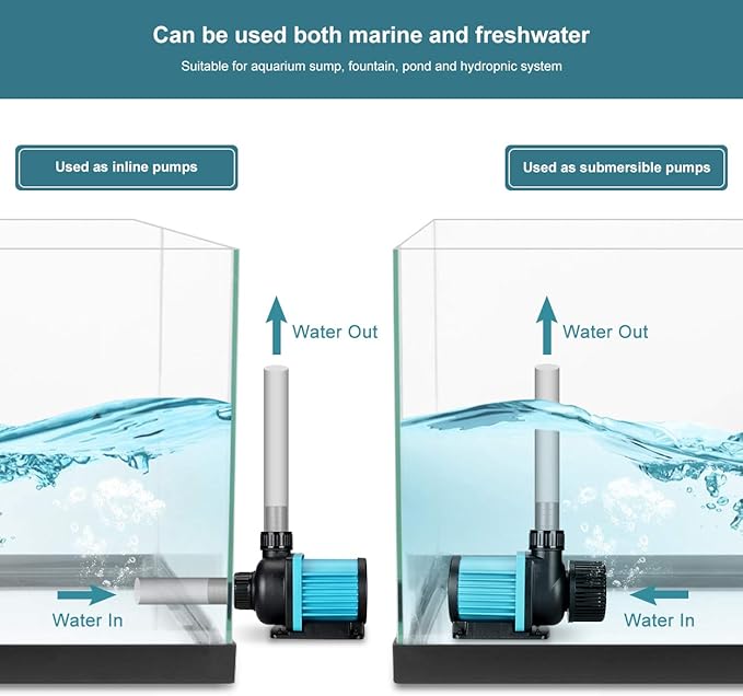 - Wide applicaion DC pump: can be used as salt water or fresh water aquarium sump pump, fountain pump,hydroponics pump and waterfall pump;can be used as external/inline or sumbersible pump;suitable for nano reef tank