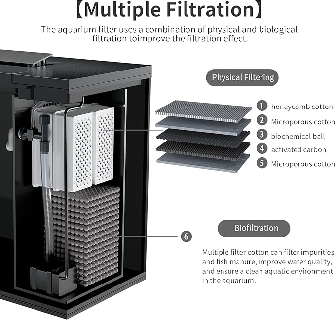 - 【Multiple Filtration-Fish Tank Self Cleaning】 The aquarium filter uses a combination of physical and biological filtration to improve the filtration effect. Multiple filter cotton can filter impurities and fish manure, improve water quality, and ensure a clean aquatic environment in the aquarium.The filter can generate abundant bubbles and water flow to provide sufficient oxygen for the fish.