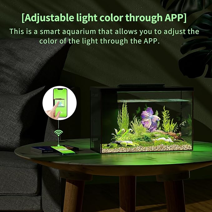 - 【Adjustable light color through APP】 This is a smart aquarium that allows you to adjust the color of the light through the APP. You can choose red, orange, yellow, green, blue, purple and other light colors. This not only promotes the growth of fish, but also makes the underwater world more colorful.The light is soft, which can protect the eyes and fish, and prevent the viewer and the fish from feeling discomfort due to the stroboscopic effect.