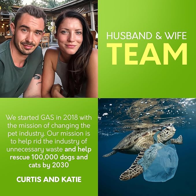 - SMALL BUSINESS WITH A BIG HEART - Founded in 2018 by Curtis and Katie, a dynamic husband and wife duo, G.A.S is not just our business - it's our passion. Dedicated to revolutionizing the pet industry, our small team is big on making a positive impact on the planet and helping animals in need. It's our mission to rescue 100,000 animals before the end of 2026.