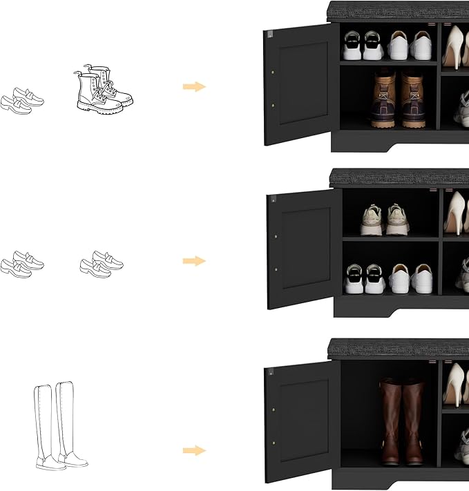 - Keep Your Shoes Organized: The depth of bench is 13.8 inches, which makes it easily to put in your shoes, meanwhile shoes of various heights can be placed by adjusting middle movable boards. The bench doors design ensures not only your privacy, but also a tidy space