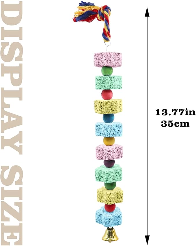 - Size and Install: The parrot calcium block toy package contains two bird teething stone toys, each bird chew toy length is 13.77"/35 CM. The top of each bird chewing toy is a colored cotton rope, you can easily hang the chew toy anywhere you want, and loading and unloading are very easy.