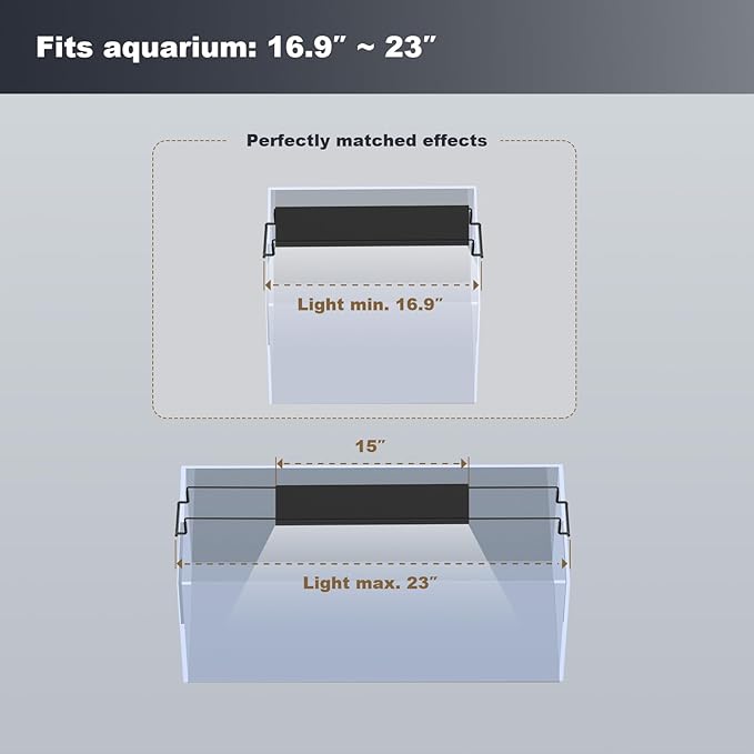 - 【Day/Night Mode】 The Day Mode consisting of white light, red light, and blue light provides bright and colorful lighting for your fish tank, resulting in excellent viewing effects. With 7 brightness adjustments (1%, 10%, 20%, 40%, 60%, 80%, 100%) and stepless dimming (1%-100%) ;The Night Mode (Blue Light) creates a soft and realistic moonlight atmosphere for your underwater world.