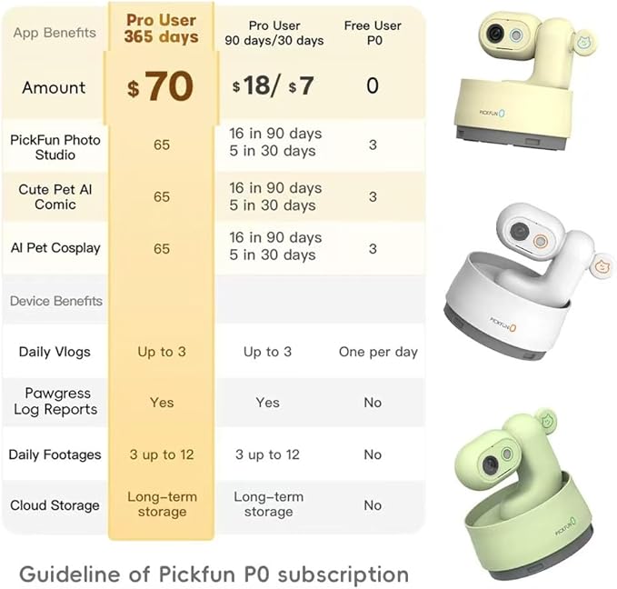 - Two storage options: Smart security camera comes with a 64GB SD card, which can store three days of footage. Dog camera also supports cloud storage. Full AI functionality and cloud video storage require a subscription, which includes a one-month free trial. Plans start at $7/month. If you have any questions, please feel free to contact our customer service center at service@pickfun.com or review our after-sales service card.