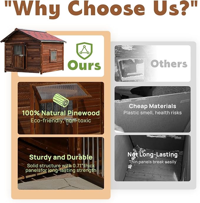 - High-Quality Pine Wood Construction: This dog house is made from durable, eco-friendly pine wood and treated with carbonization for added strength. It provides a safe, comfortable, and long-lasting home that can withstand chewing and rough play, ensuring years of reliable use.