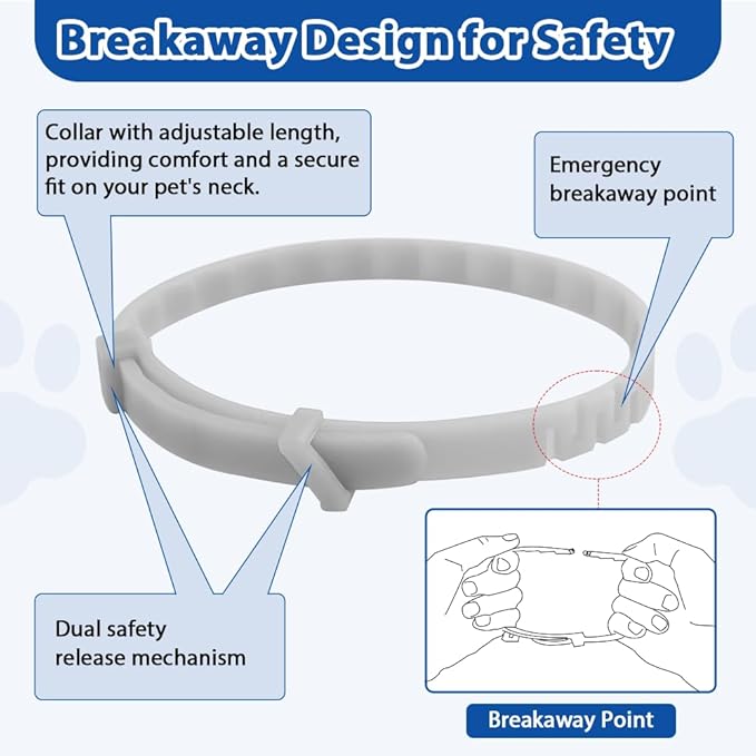 - Unique Dual Safety Release Mechanism & Emergency Breaks Away Point: This cat flea collar is equipped with a dual safety release mechanism and an emergency breaks away point, ensuring maximum safety for your pet. Even during active play or outdoor adventures, the collar stays securely in place, providing continuous protection. If your cat gets caught or pulls on the collar, it will safely break away to prevent injury, giving you peace of mind knowing your pet is safe.