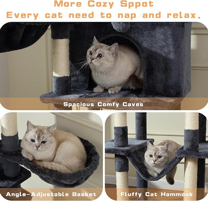 - [Premium Materials]The multi-level cat tree is made of high-density P2 grade particle board and high-quality plush, the cat posts are covered with natural instincts sisal rope to satisfy your cat's natural desire to sharpen its claws.