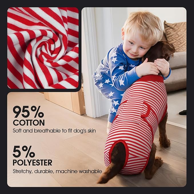 - [BREATHABLE FABRIC]: Our dog recovery suit is made of 95% cotton and 5% spandex. The recovery shirt is highly elastic and breathable, allowing the dog to feel comfortable and move freely after wearing it. No deformation after machine wash.