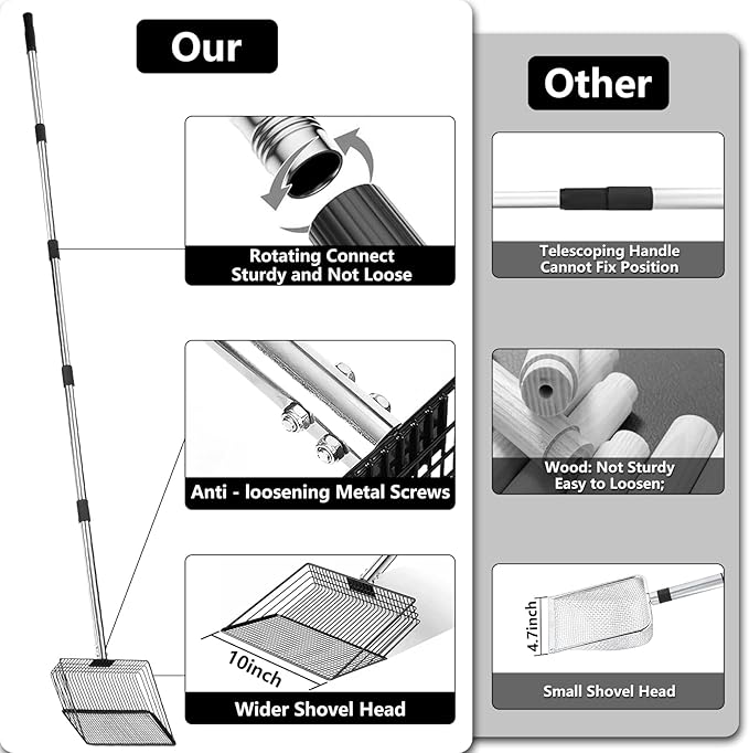 - ๐ง Multi-Purpose Sifter Shovel: More than just a chicken coop cleaner, this tool transforms easily into a cat litter scoop, sandbox shovel, cow stall cleaner, or beach sand scooper. Perfect for farmers, pet owners, and outdoor enthusiasts looking for a reliable, all-in-one cleaning tool