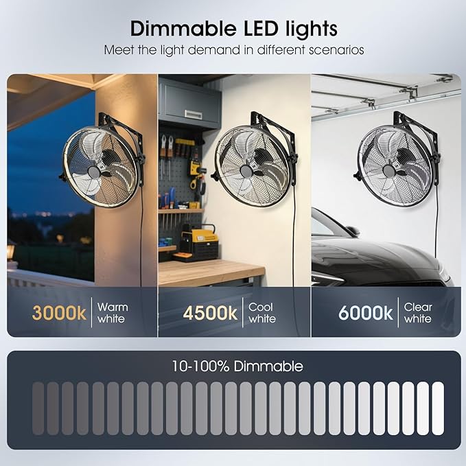 - 【Wall Mount Fan】Our wall fan with full metal casing,safer.The fan combines cooling and lighting in one,you can adjust wind speed,light,timing,reversible and many other functions,comes with a 7.5ft power cord,giving you the flexibility to place the outdoor fan in covered patios,garages,warehouses and factories.