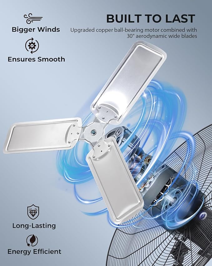 - Durable & Low-Noise: Our wall mounted fan is equipped with upgraded copper ball-bearing motor and 30" aerodynamic wide blades to a farther air movement range at lower noise. Designed for safety and reliability, industrial wall fan includes an OSHA compliant protective grille, a 9.8 ft grounded 3-prong power cord, powder-coated steel construction, and built-in overheating protection, making it the ideal cooling solution for demanding environments.