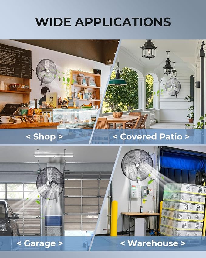 - Easy to Assemble & Use: 30 inch heavy duty oscillating fan included wall mounting hardware for a fast install on concrete walls. Just drill, mount the bracket, attach the blades and grille, and enjoy cooling in under 5 minutes!