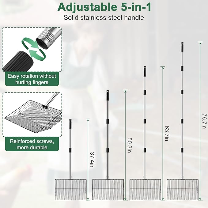 - ๐ [5 in 1 Adjustable Handle] Our stainless steel chicken pooper scooper can be adjustable to 24", 38", 51", 64" and 77" by simple rotation, which is convenient for people of different heights/different scenarios to use. The longer handle makes it comfortable and effortless for you to use.