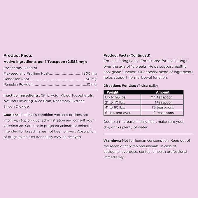 - For additional health benefits, the powder is made with beet pulp, psyllium husk, and pumpkin powder, which are all great sources of fiber to help keep your dog regular.