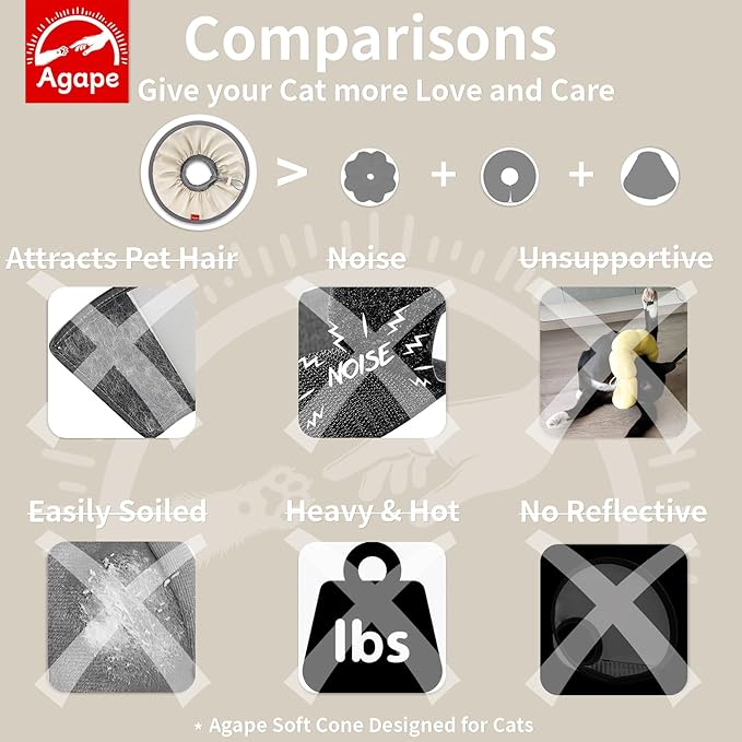 - 【Soft & Lightweight】Unlike bulky, uncomfortable cones on the market, Agape's cat cone is made with two layers of silky fabric and a ribbed knit collar, weighing just 1.7 ounces—about the same as two single AA battery. This ultra-light, breathable, and soft design ensures your cat can sleep peacefully and comfortably, without feeling any strain or restriction around their neck