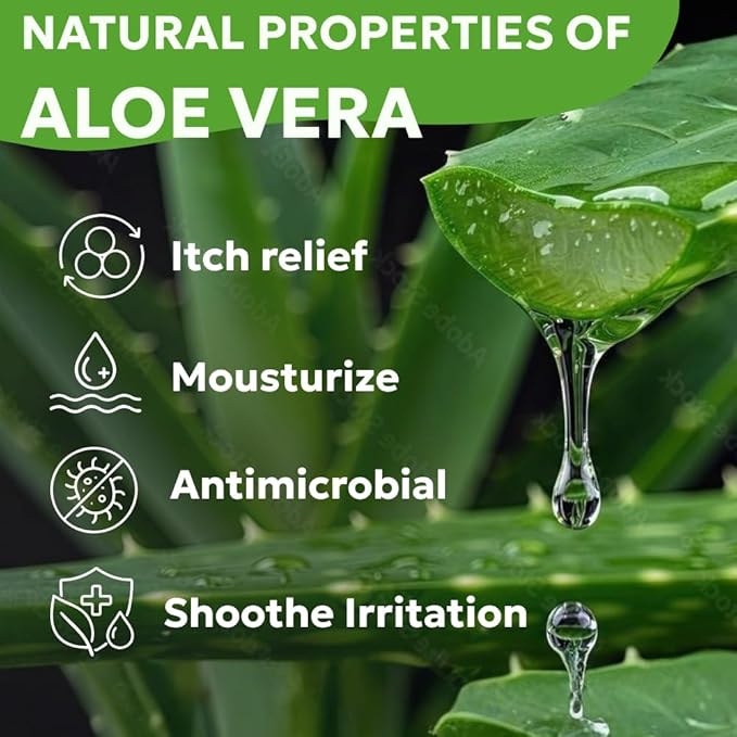 - ALOE VERA's anti-inflammatory natural properties can help calm irritated skin and reduce redness associated with itching. Aloe vera's antibacterial and antifungal properties can help prevent infection and speed up the healing process for minor cuts, abrasions, and hot spots. It can help reduce redness and irritation, promote healing, and moisturize dry skin.