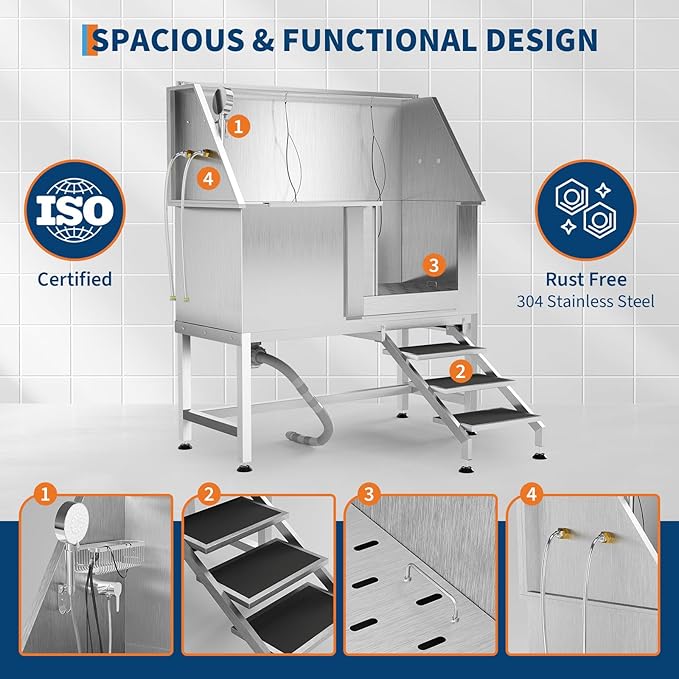 - Efficient Drainage System Removable floor grate prevents water accumulation and simplifies post-bath cleanup. Maintains tidy workspace during grooming sessions.